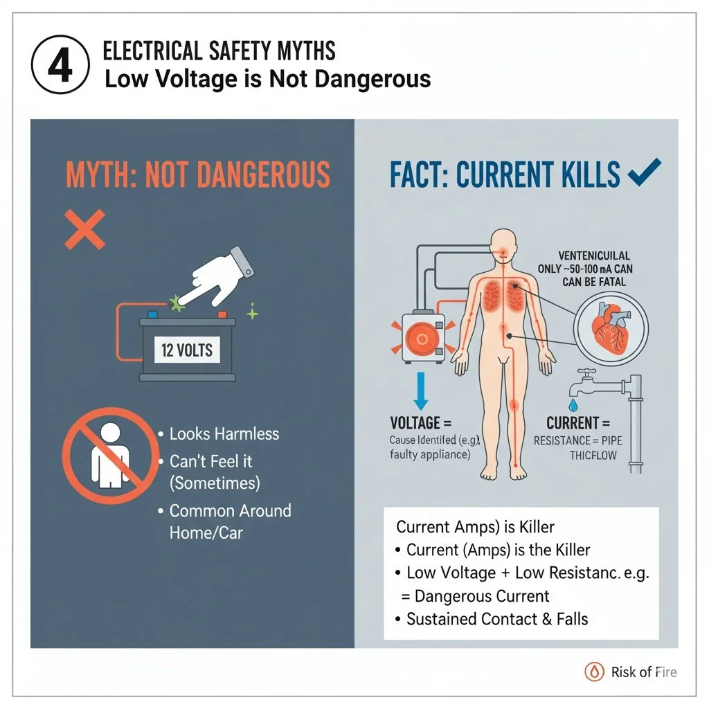 Reality: Even low voltage can be dangerous and cause serious injury or death, as current is what kills, not just voltage.